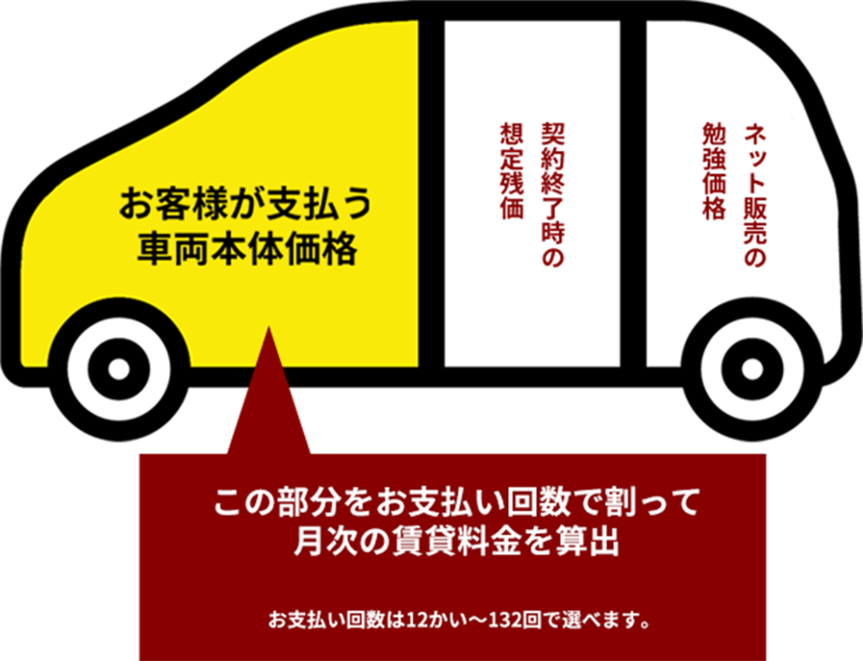車両代金、登録諸費用、自動車税環境性能割、契約期間中の各種税金・保険(自動車税種別割、重量税、自賠責保険料、自動車保険(任意保険)料)、メンテナンス費用(点検、故障修理等)が含まれます。